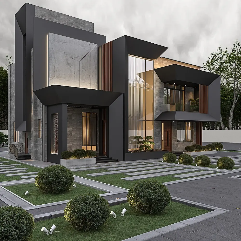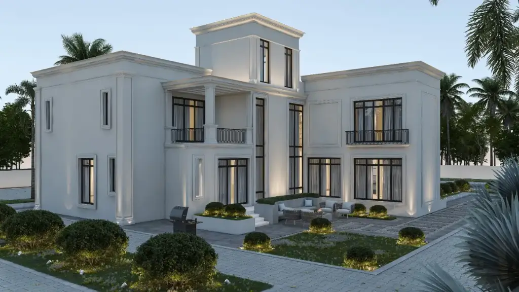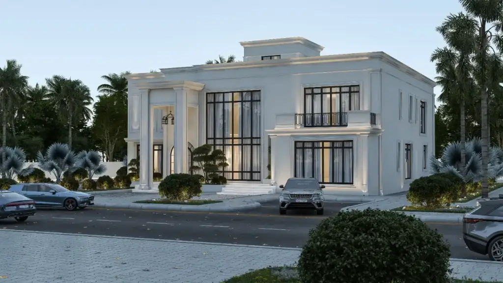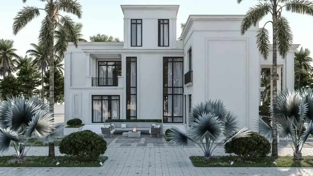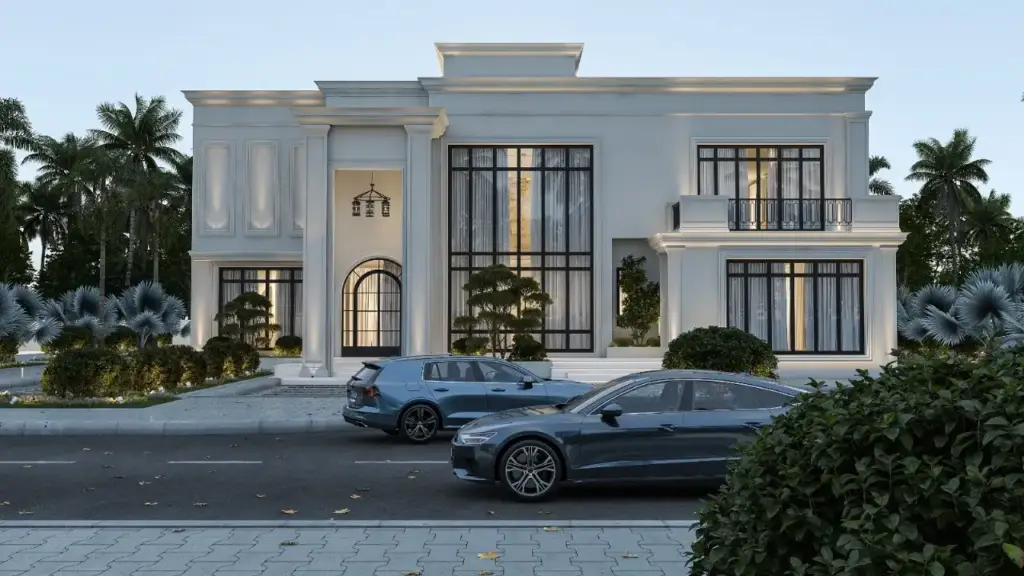 The striking double-height entrance with classic columns creates a sense of elegance and scale, while the landscape design blends greenery with modern outdoor detailing to enhance the villa’s architectural presence.
