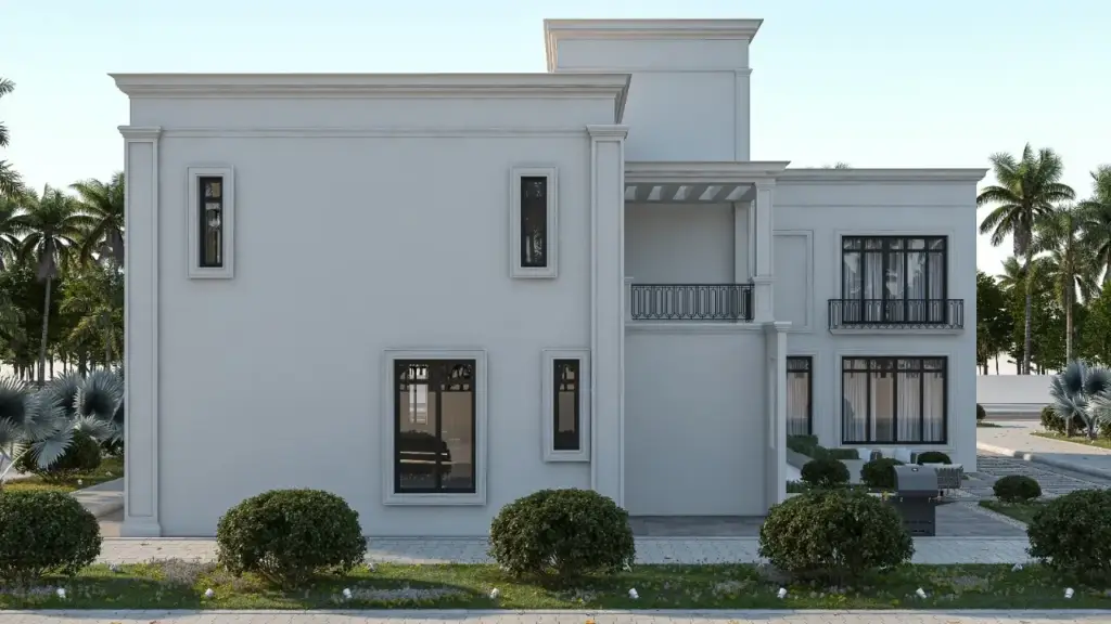 This luxury villa at Saadiyat Island embodies grandeur with a timeless contemporary touch. The façade features clean white tones complemented by expansive floor-to-ceiling windows that flood the interiors with natural light while offering panoramic views.